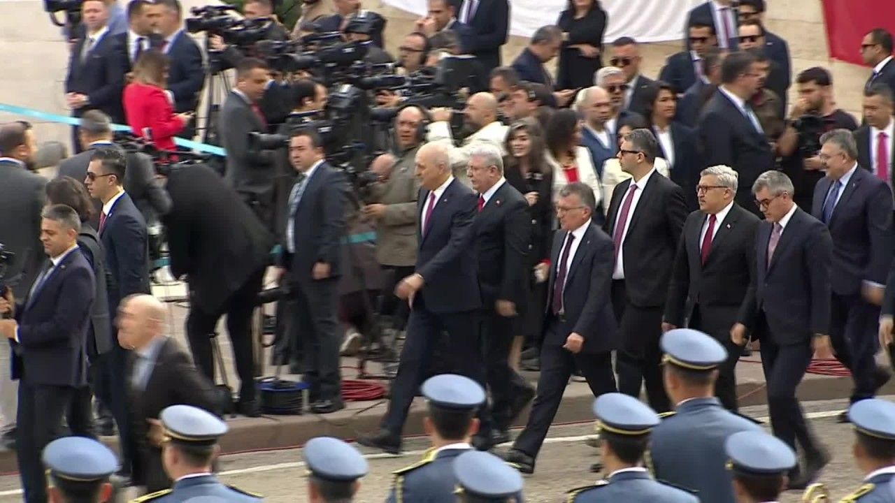 Kurtulmuş, kırmızı ve beyaz karanfillerden oluşan çelengi Atatürk Anıtı’na sunarak, saygı duruşunda bulundu. Törenin ardından heyet, otobüslerle Anıtkabir’de yapılacak resmî törene katılmak üzere Meclis’ten ayrıldı.