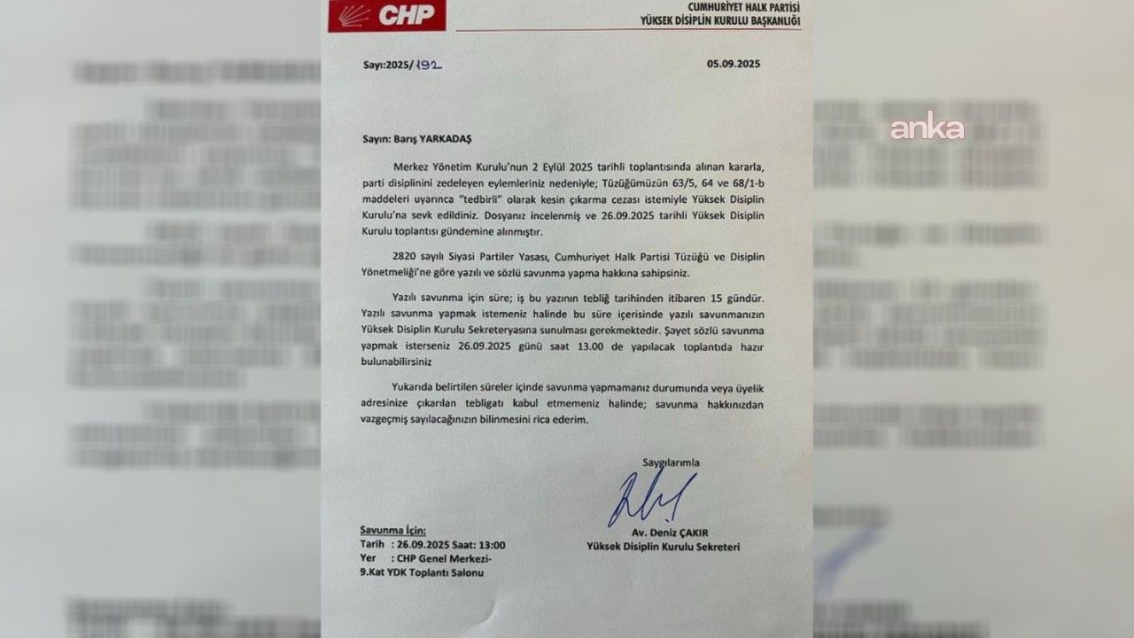 Dosyanız incelenmiş ve 26.09.2025 tarihli Yüksek Disiplin Kurulu toplantısı gündemine alınmıştır. 2820 sayılı Siyasi Partiler Yasası, Cumhuriyet Halk Partisi Tüzüğü ve Disiplin Yönetmeliği'ne göre yazılı ve sözlü savunma yapma hakkına sahipsiniz. Yazılı savunma için süre; işbu yazının tebliğ tarihinden itibaren 15 gündür. Yazılı savunma yapmak istemeniz halinde bu süre içerisinde yazılı savunmanızın Yüksek Disiplin Kurulu Sekreteryasına sunulması gerekmektedir. Şayet sözlü savunma yapmak isterseniz 26.09.2025 günü saat 13.00 de yapılacak toplantıda hazır bulunabilirsiniz.